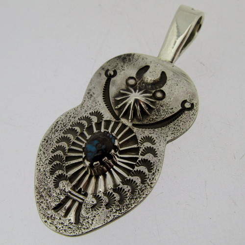 そんな中15年前、博物館で古いナバホ族のスタンプワークのジュエリーを見て、伝統的なスタイルのジュエリーへの感銘をうけ、1年に1作品ほどのペースで、伝統的スタイルへの尊敬をこめて作品を作るようになる。
